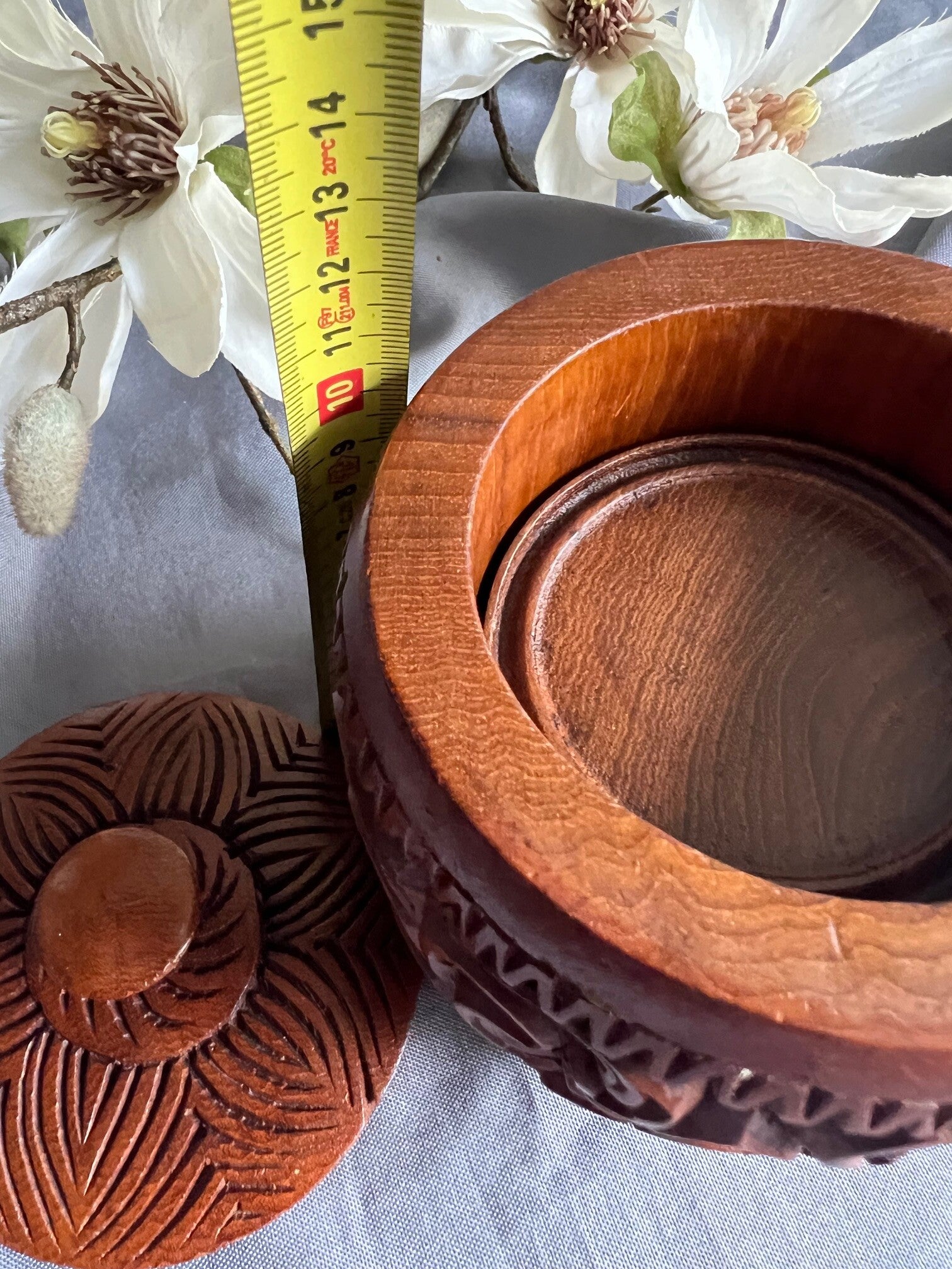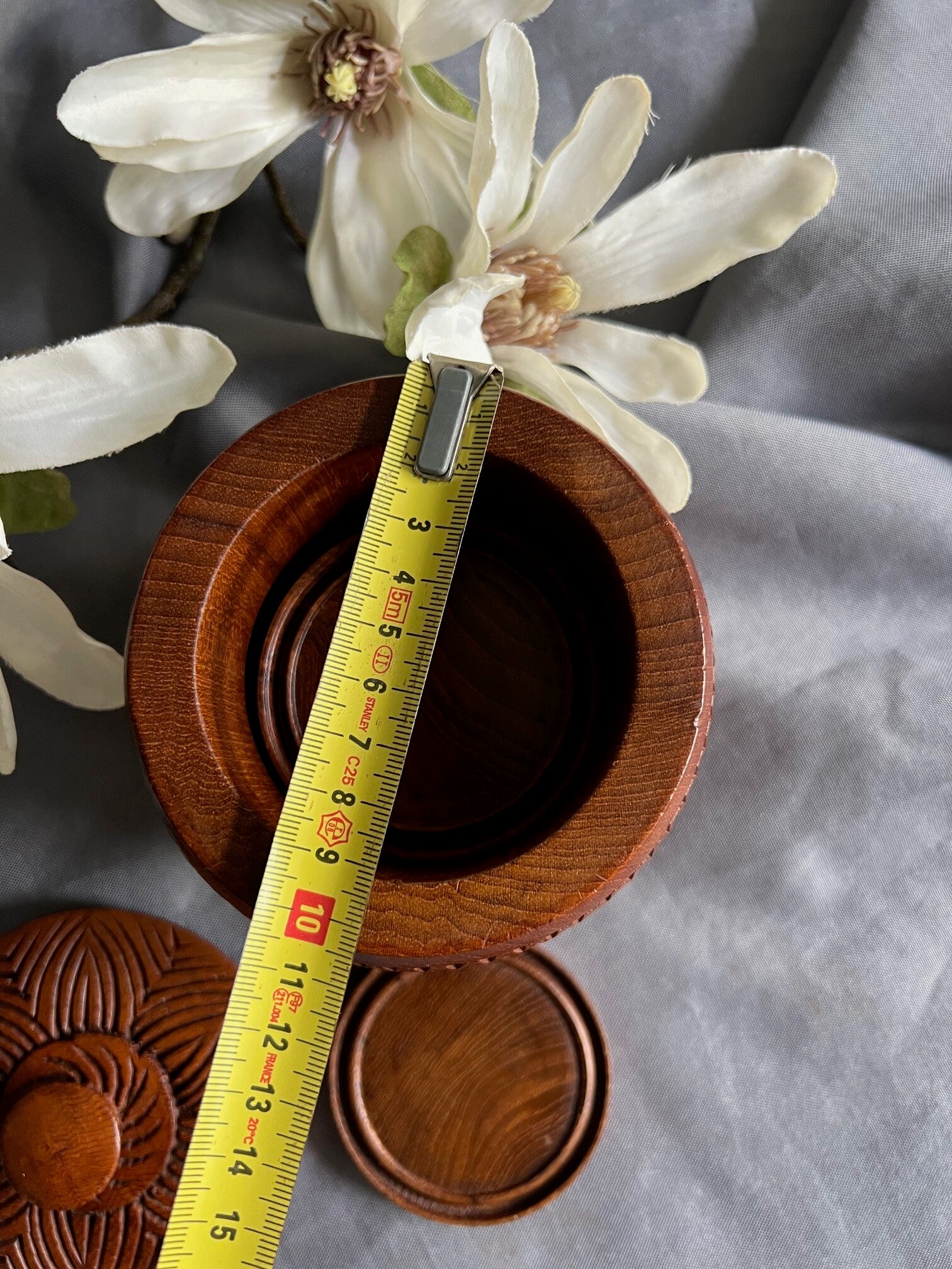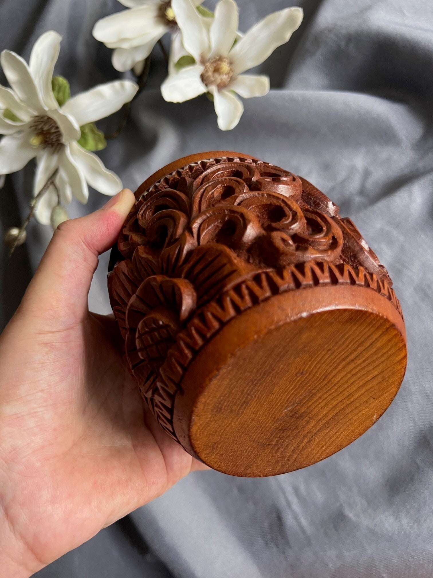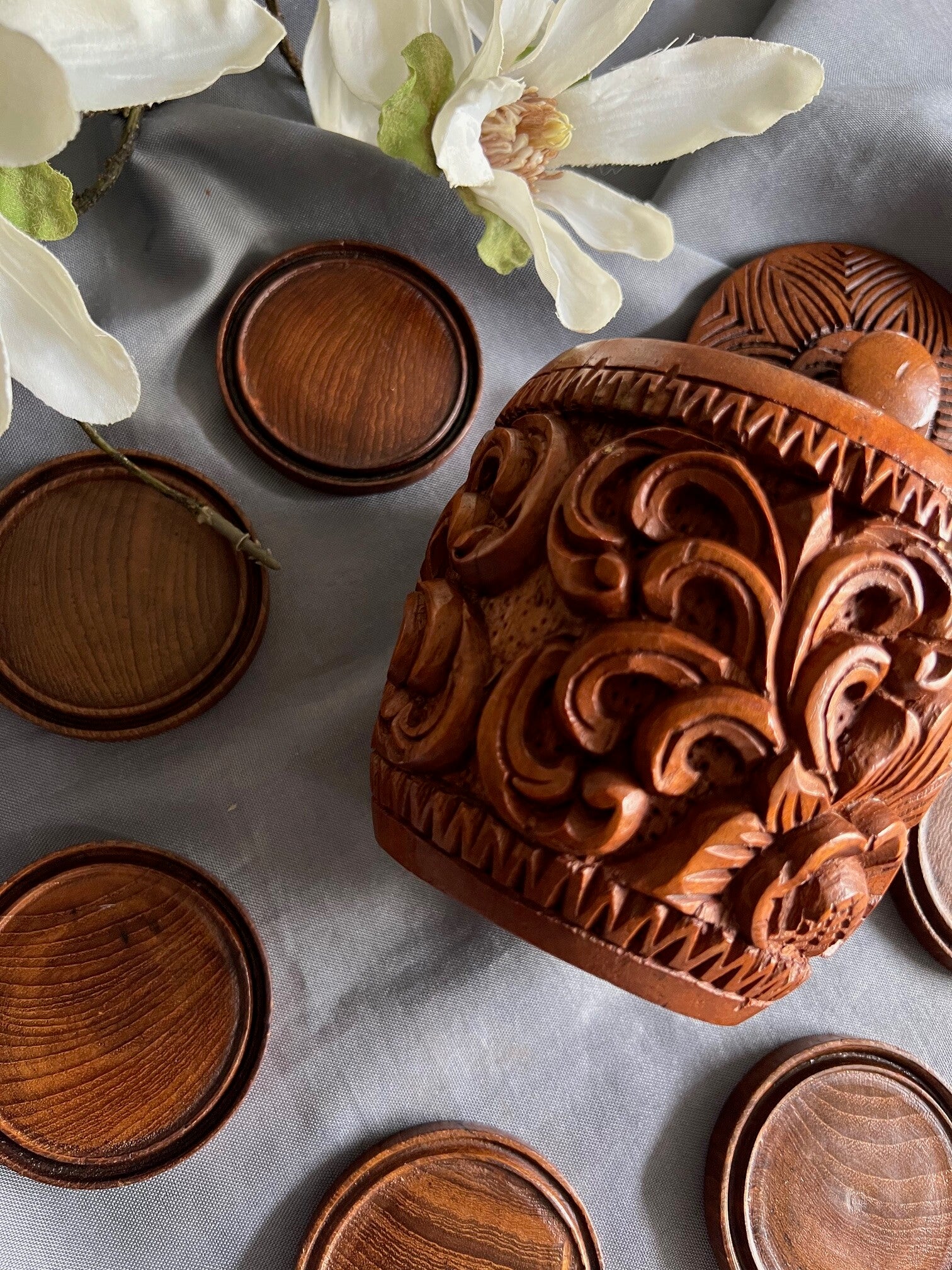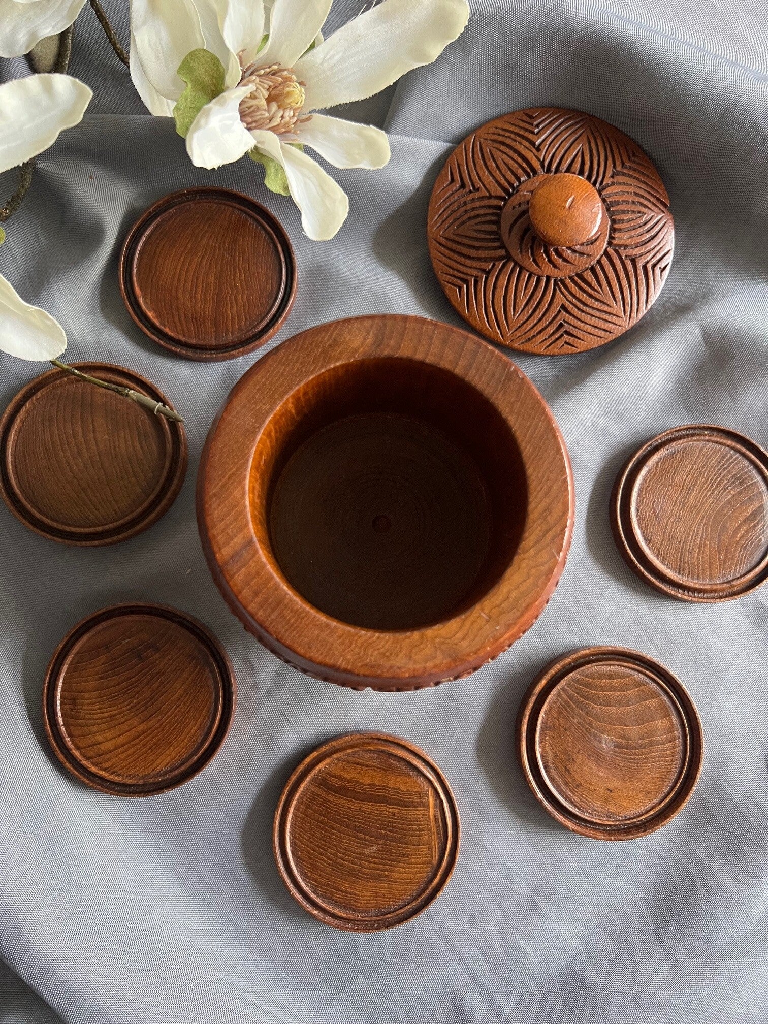 Charmante houten bewaarpot inclusief onderzetters. Authentiek design uit Azië, bijzonder uniek en perfect voor dagelijks gebruik of sfeer in huis.