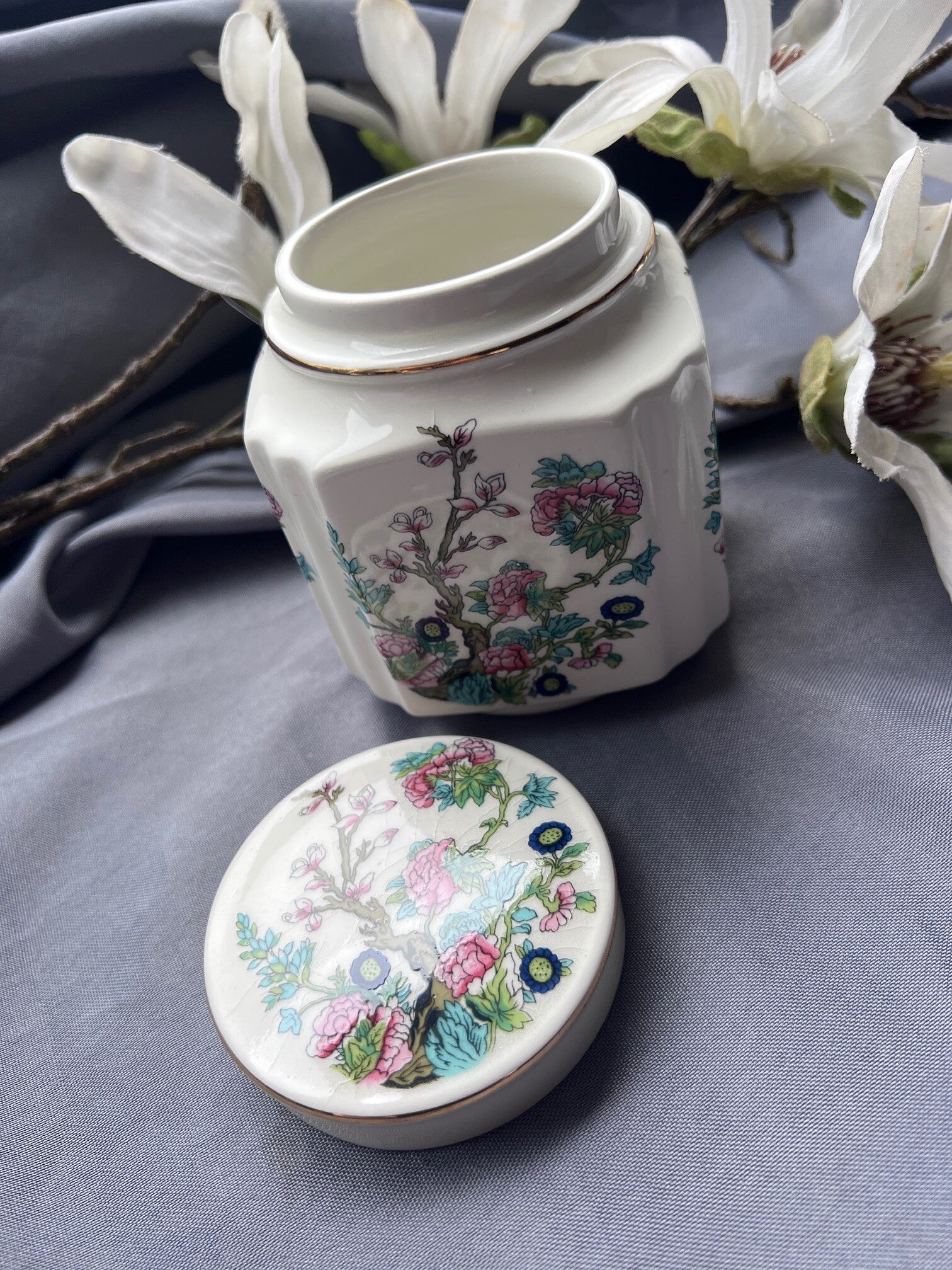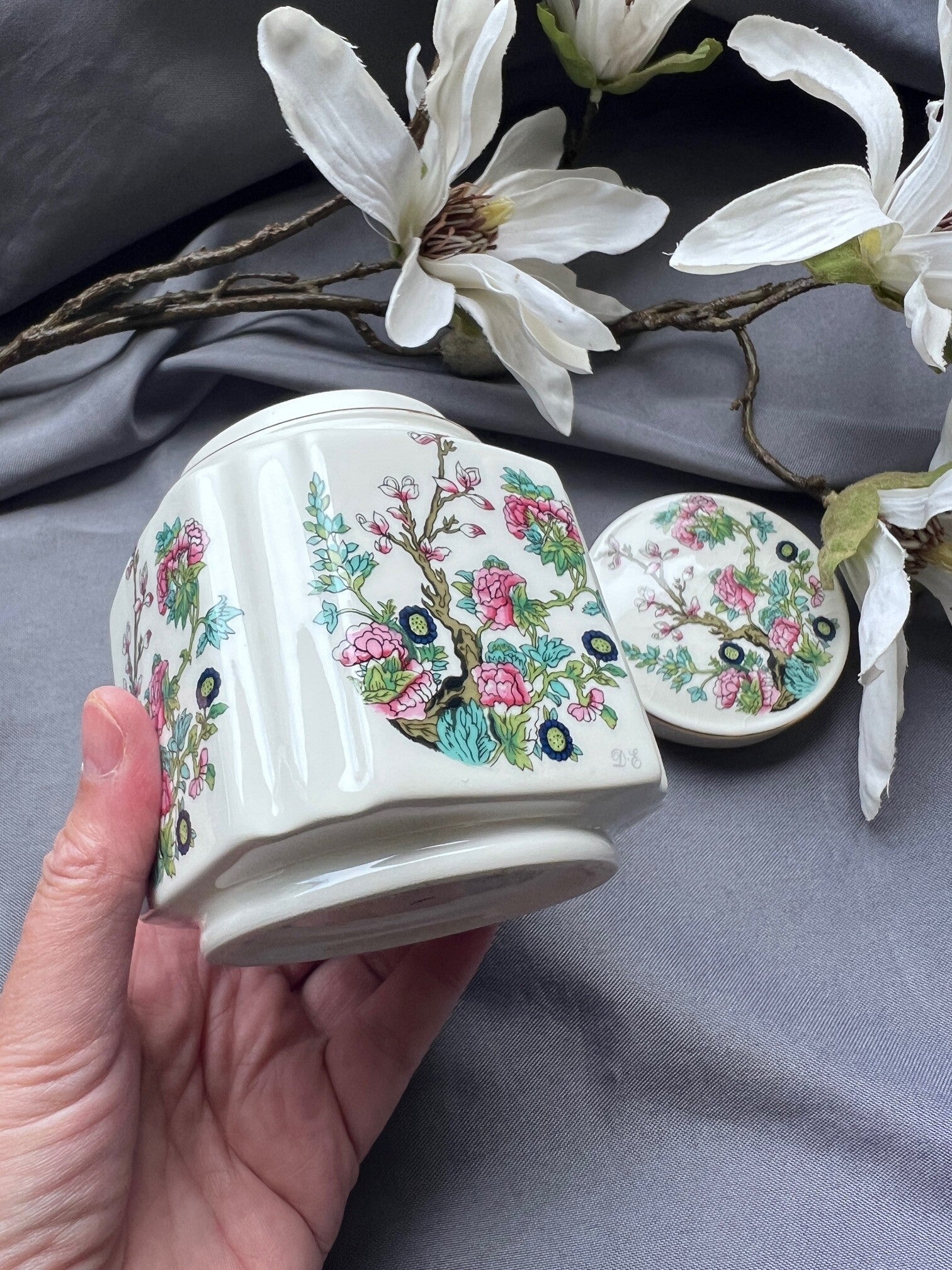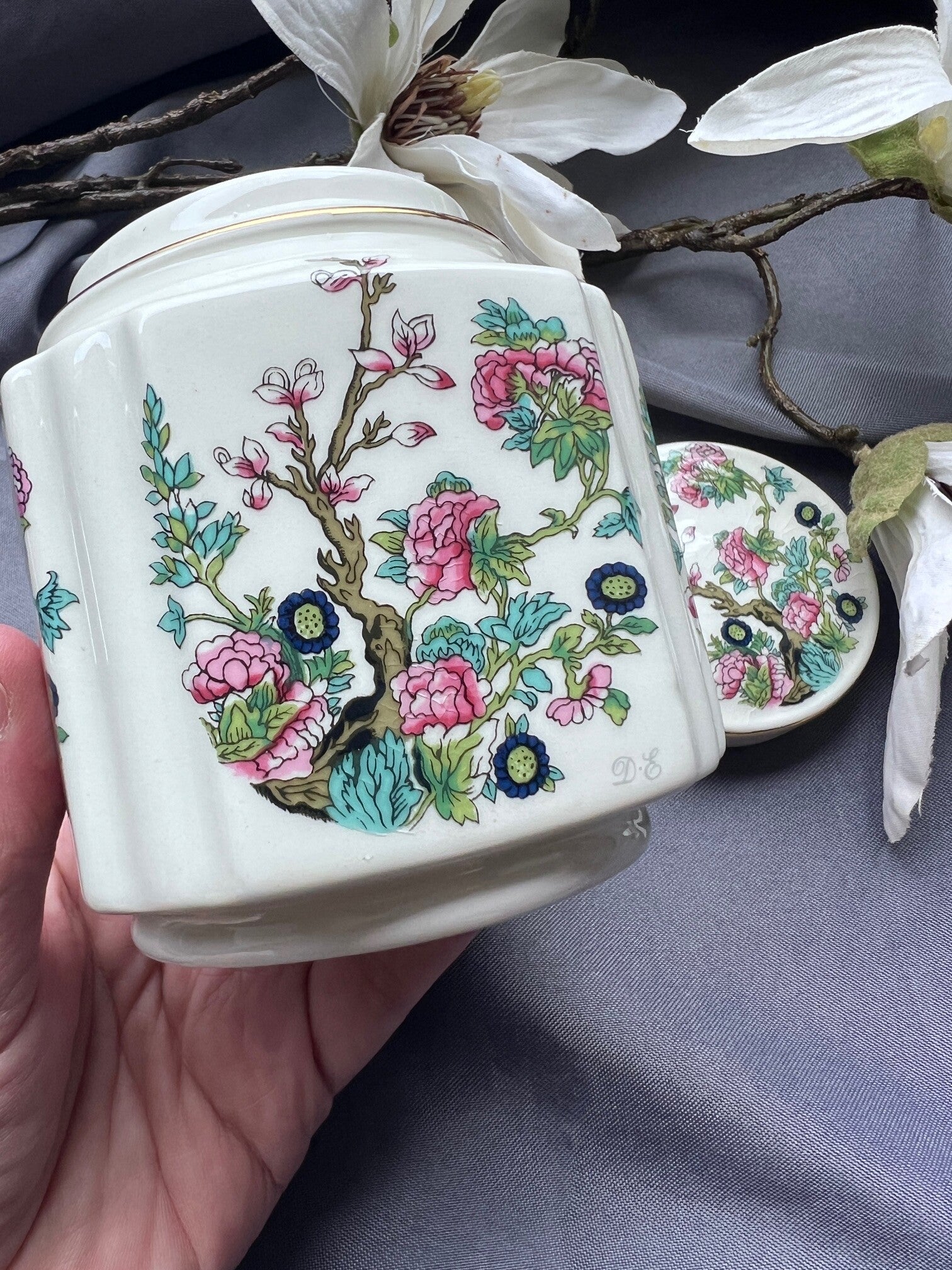 Deze porseleinen theebus van Douwe Egberts is een charmant vintage voorraadpotje voor losse thee. Het potje heeft een elegante, gefacetteerde vorm en is gedecoreerd met een kleurrijk bloemmotief dat geïnspireerd is op Aziatische porseleintradities. De fijne goudrand langs het deksel geeft het geheel een klassieke uitstraling.
