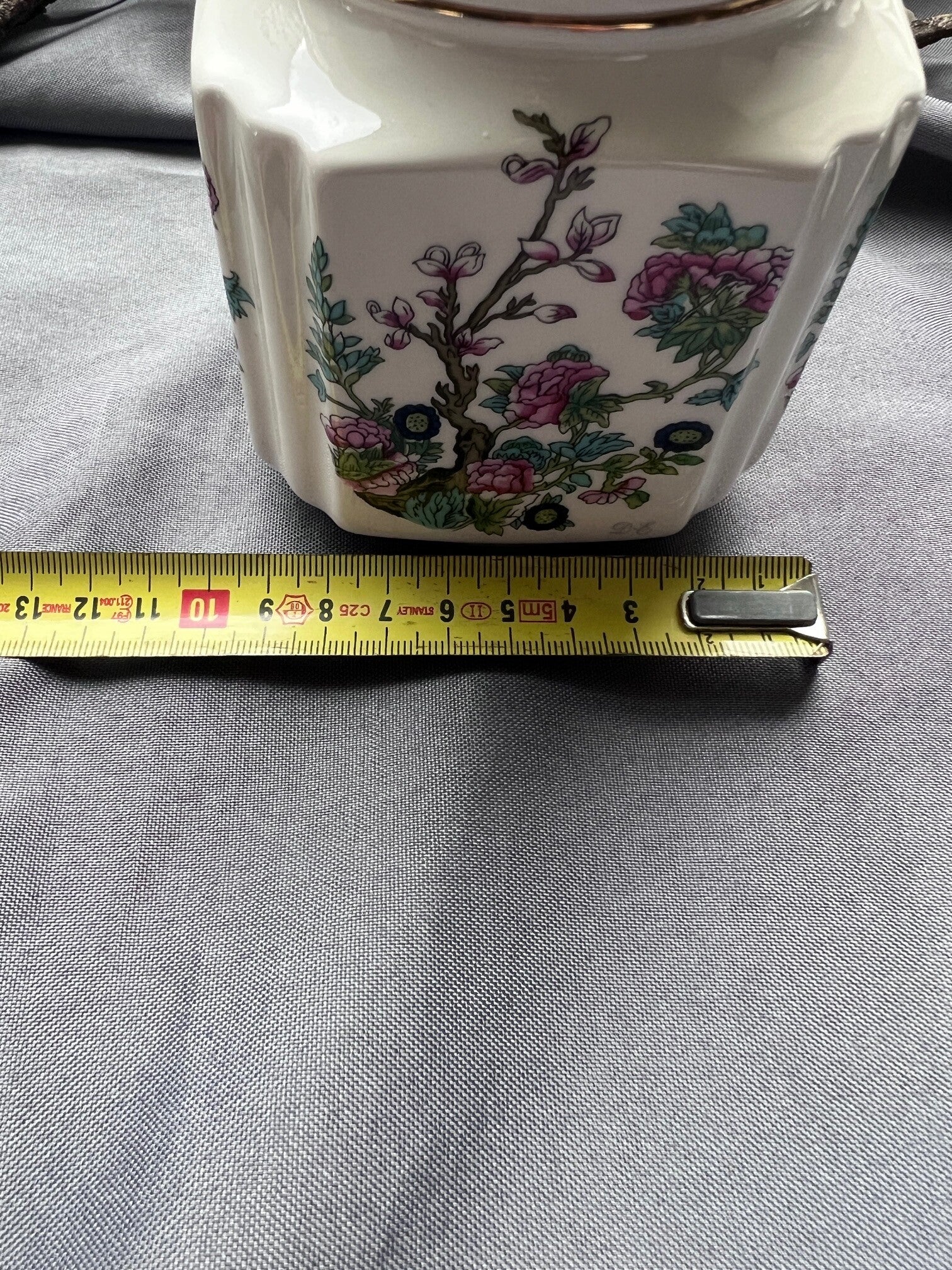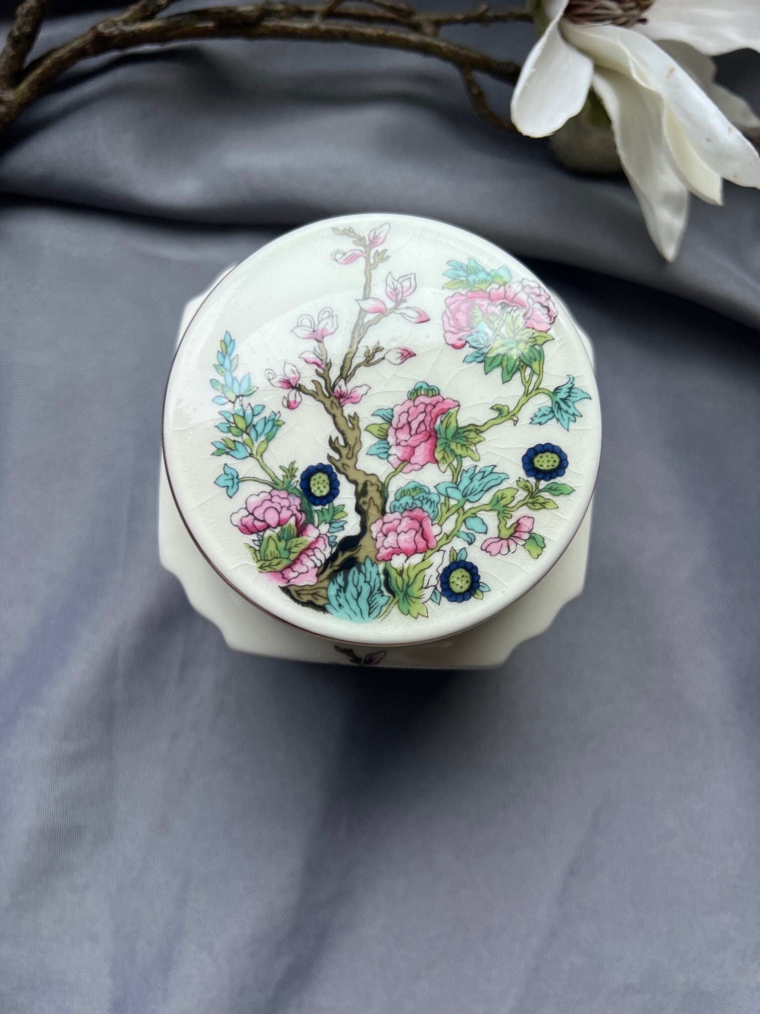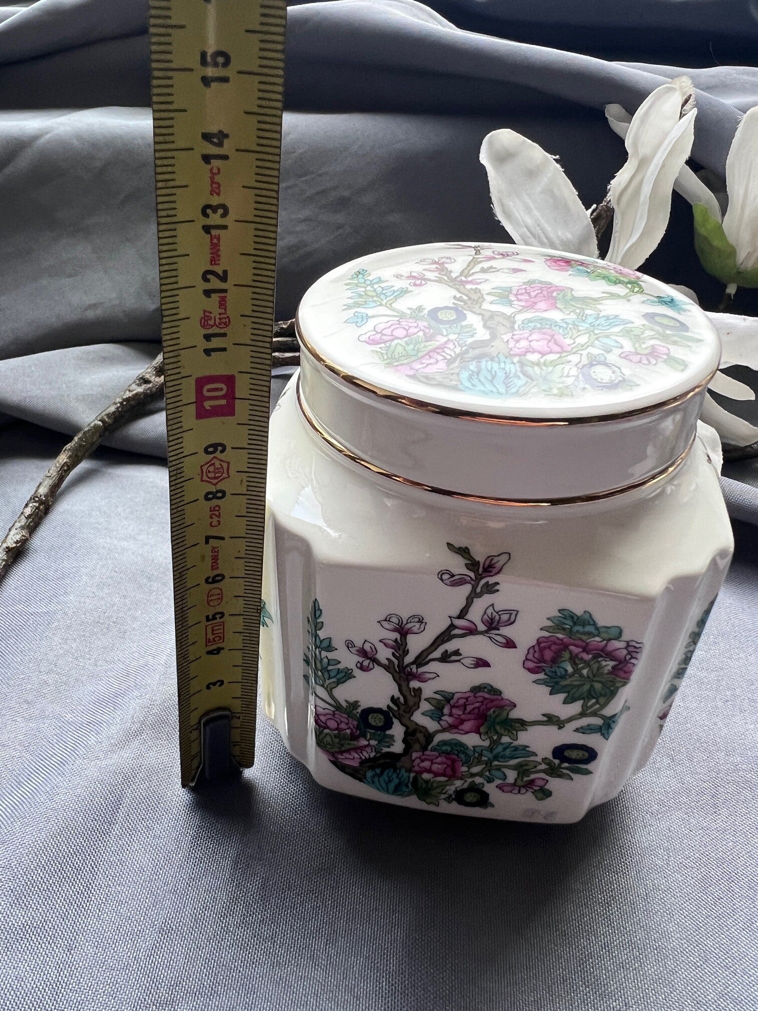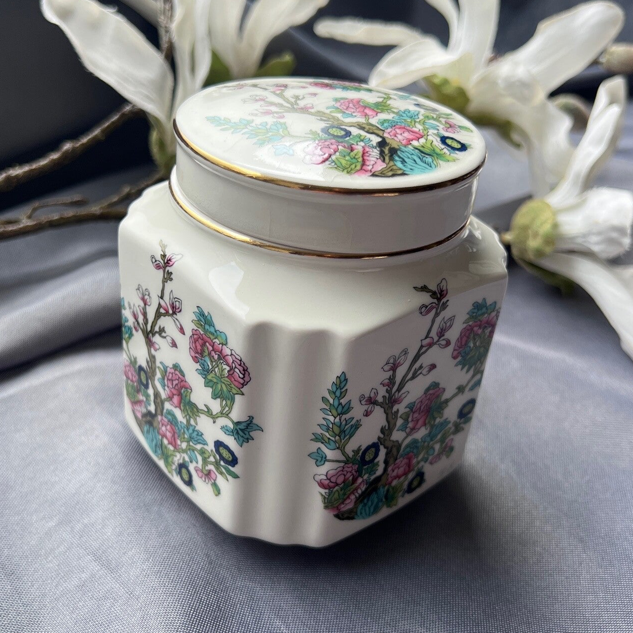 Deze porseleinen theebus van Douwe Egberts is een charmant vintage voorraadpotje voor losse thee. Het potje heeft een elegante, gefacetteerde vorm en is gedecoreerd met een kleurrijk bloemmotief dat geïnspireerd is op Aziatische porseleintradities. De fijne goudrand langs het deksel geeft het geheel een klassieke uitstraling.