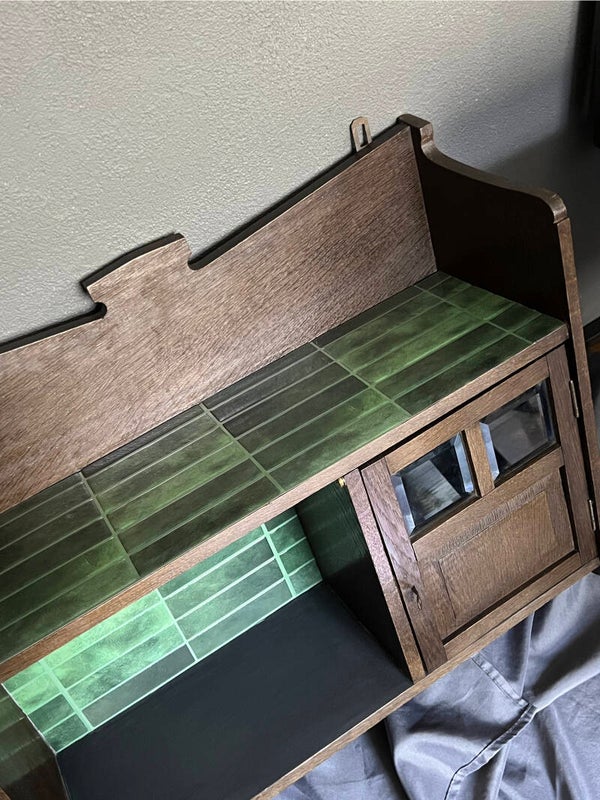Prachtig authentiek muurkastje uit circa 1920, uitgevoerd in eikenhout en beïnvloed door de Amsterdamse School-stijl. Het kastje is voorzien van een deurtje met facetgeslepen glas en een messing gordijnstang (gordijn is verwijderd). De achterwand is in stijlvol donkergroen gepimpt met glanzende wandtegels, wat het stuk een unieke en frisse uitstraling geeft.