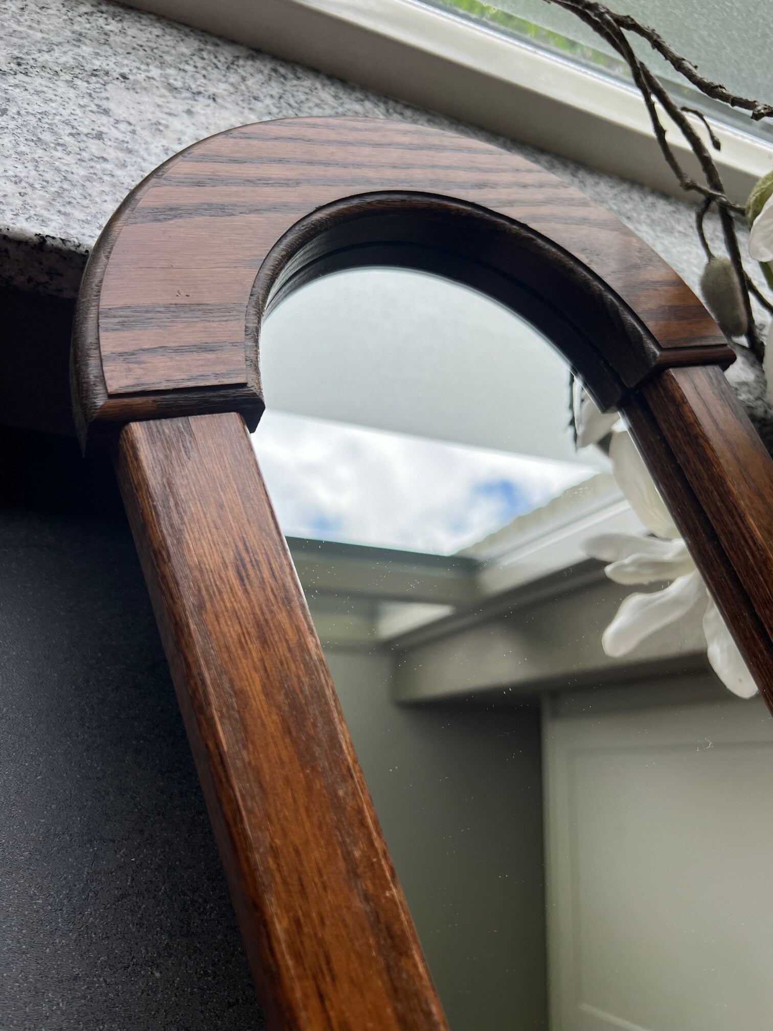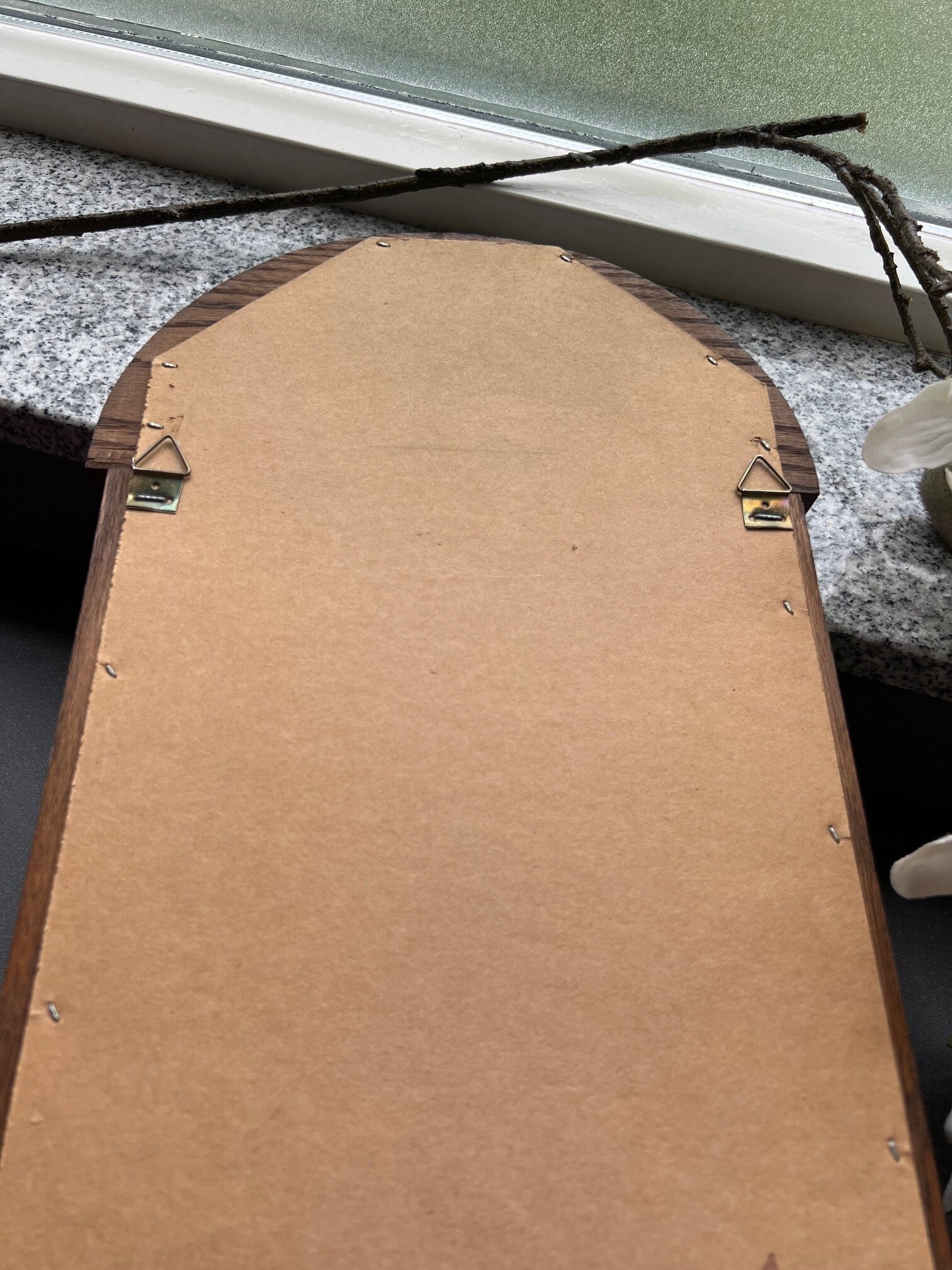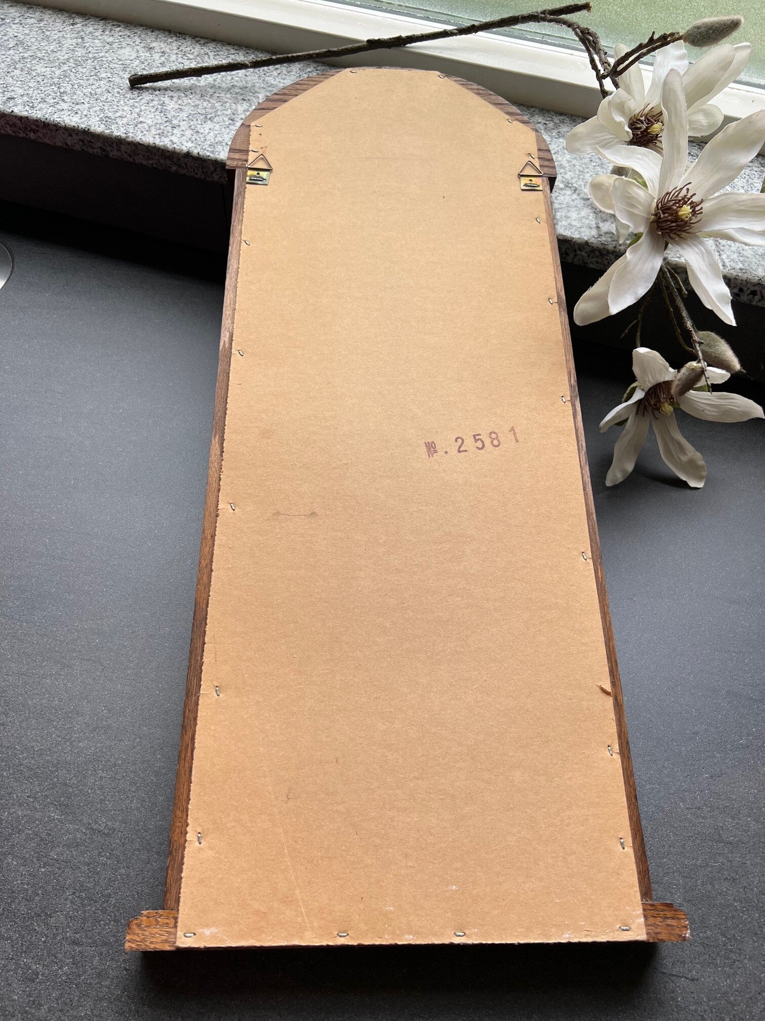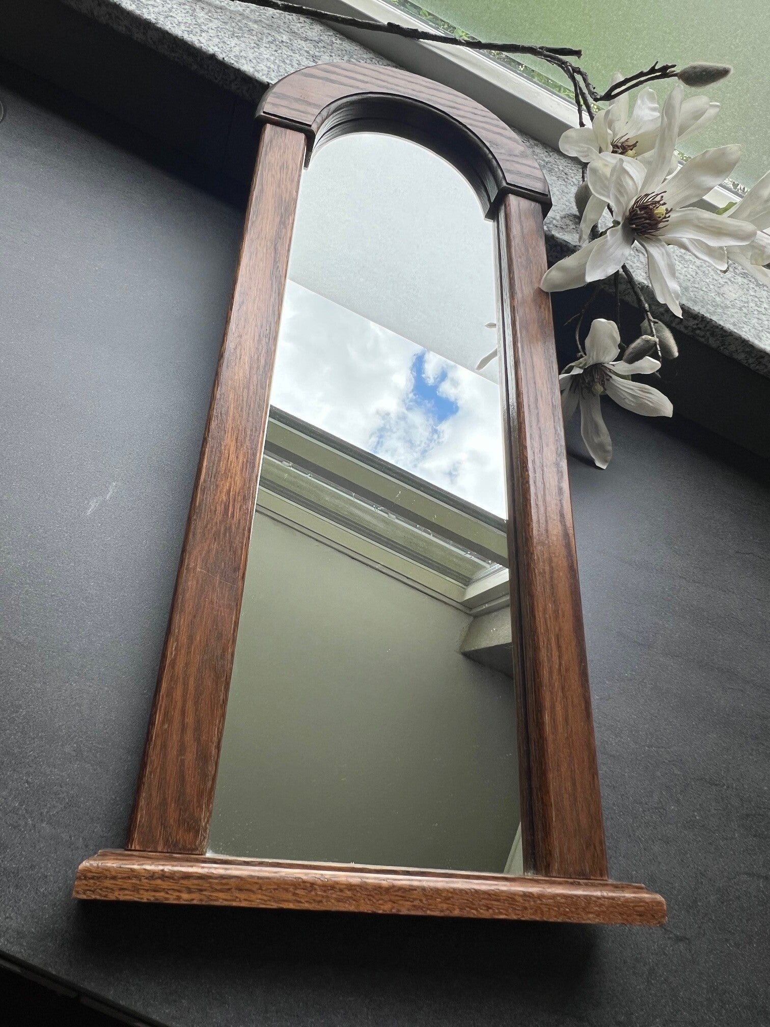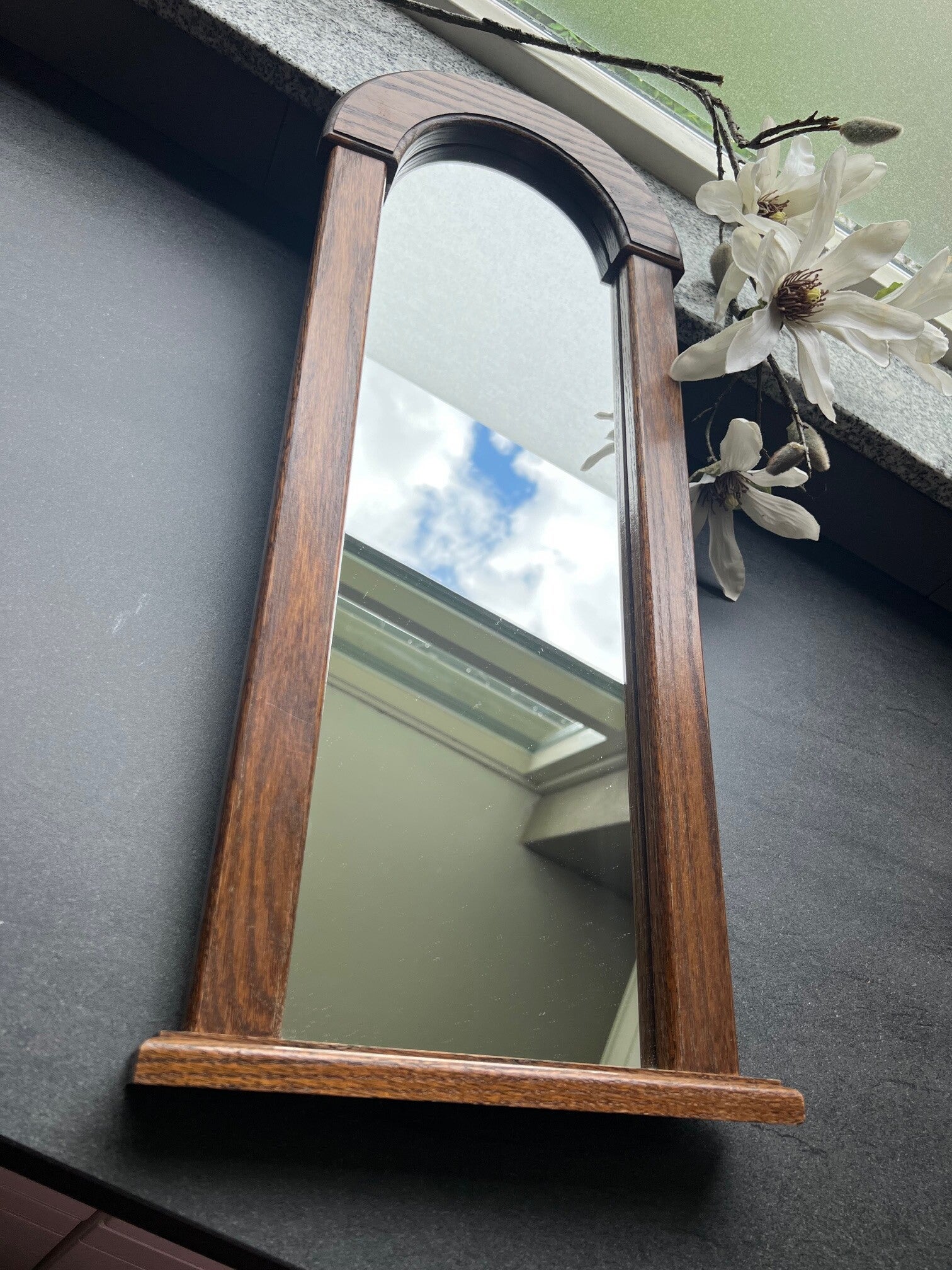 Mooie spiegel (63 cm hoog ongeveer en 25 cm breed) met een klein schapje eronder. Ideaal voor in de hal, het schapje is niet zo diep , kan net een aansteker op liggen b.v.
