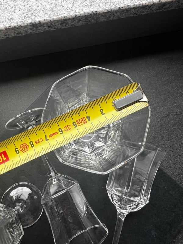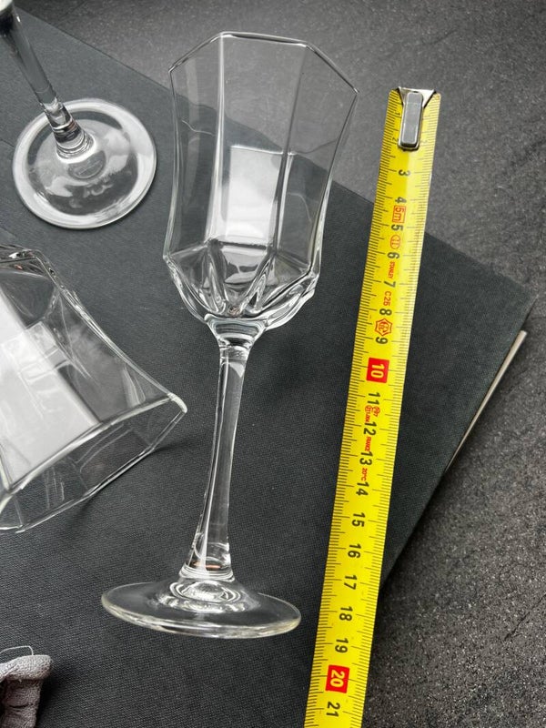 Prachtige set van 4 wijnglazen uit de bekende Octime serie van Luminarc. Deze glazen hebben de kenmerkende acht-hoekige vorm (octagon) en een elegante, tijdloze uitstraling. De glazen zijn ca. 18 cm hoog en verkeren in mooie vintage staat zonder chips of barsten. Onder de voet gemerkt met “France”. Perfect voor liefhebbers van vintage servies, jaren 70/80 design of als stijlvolle toevoeging aan je tafelsetting.