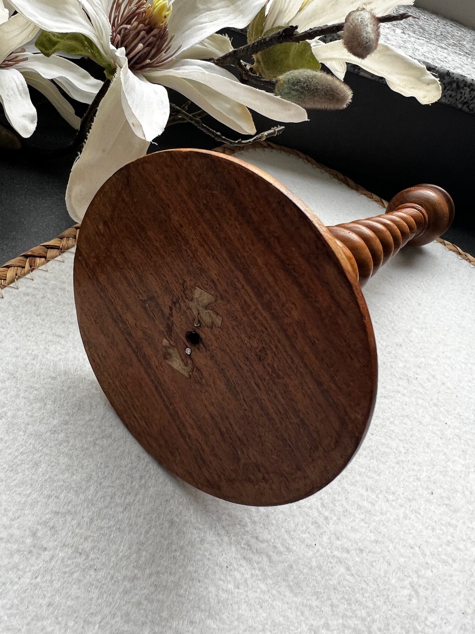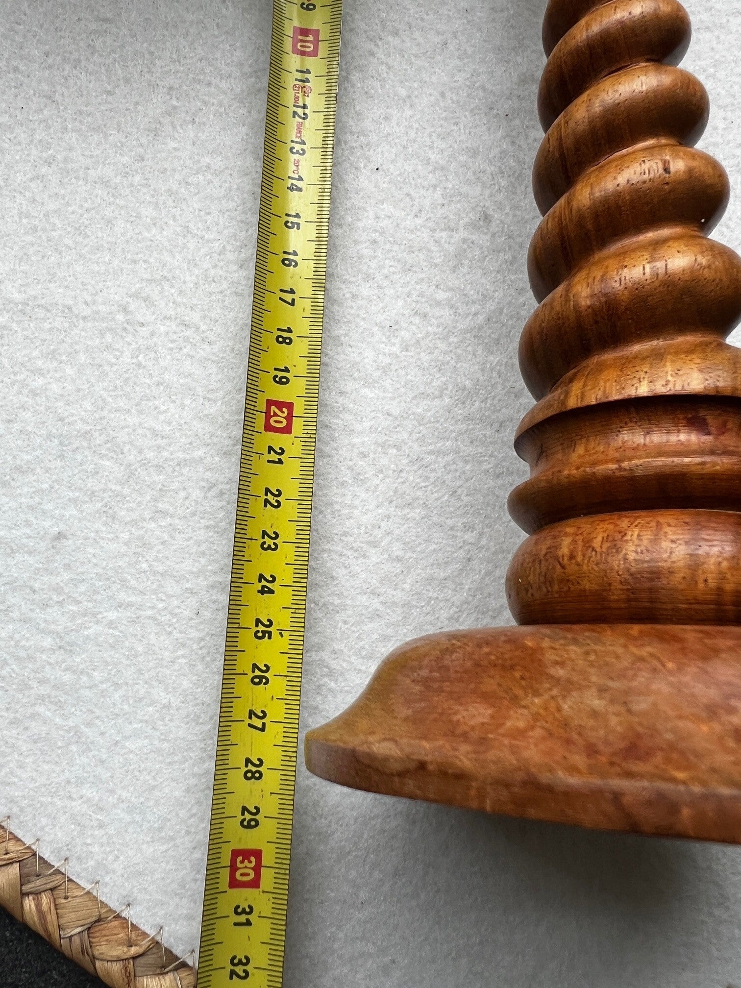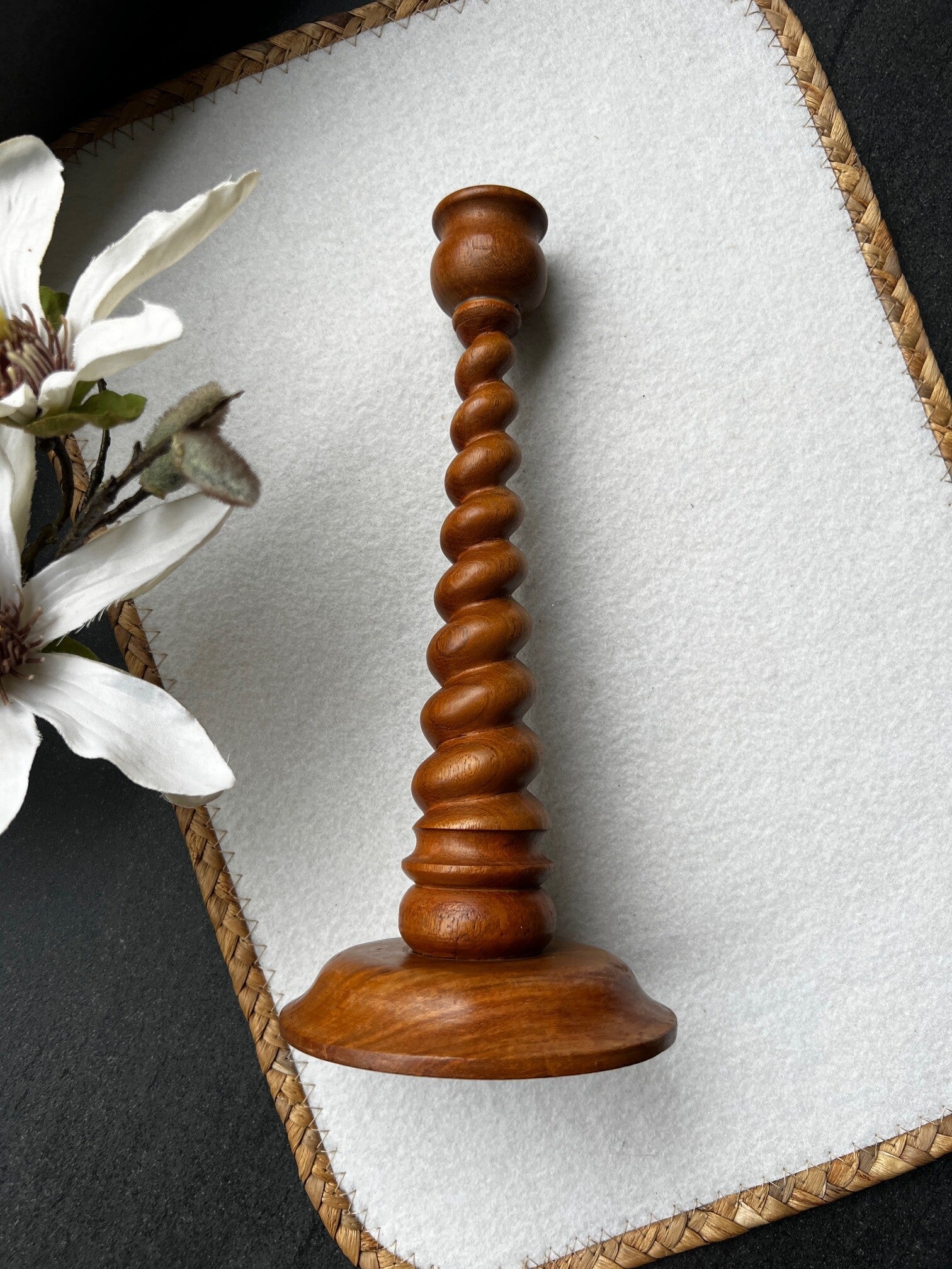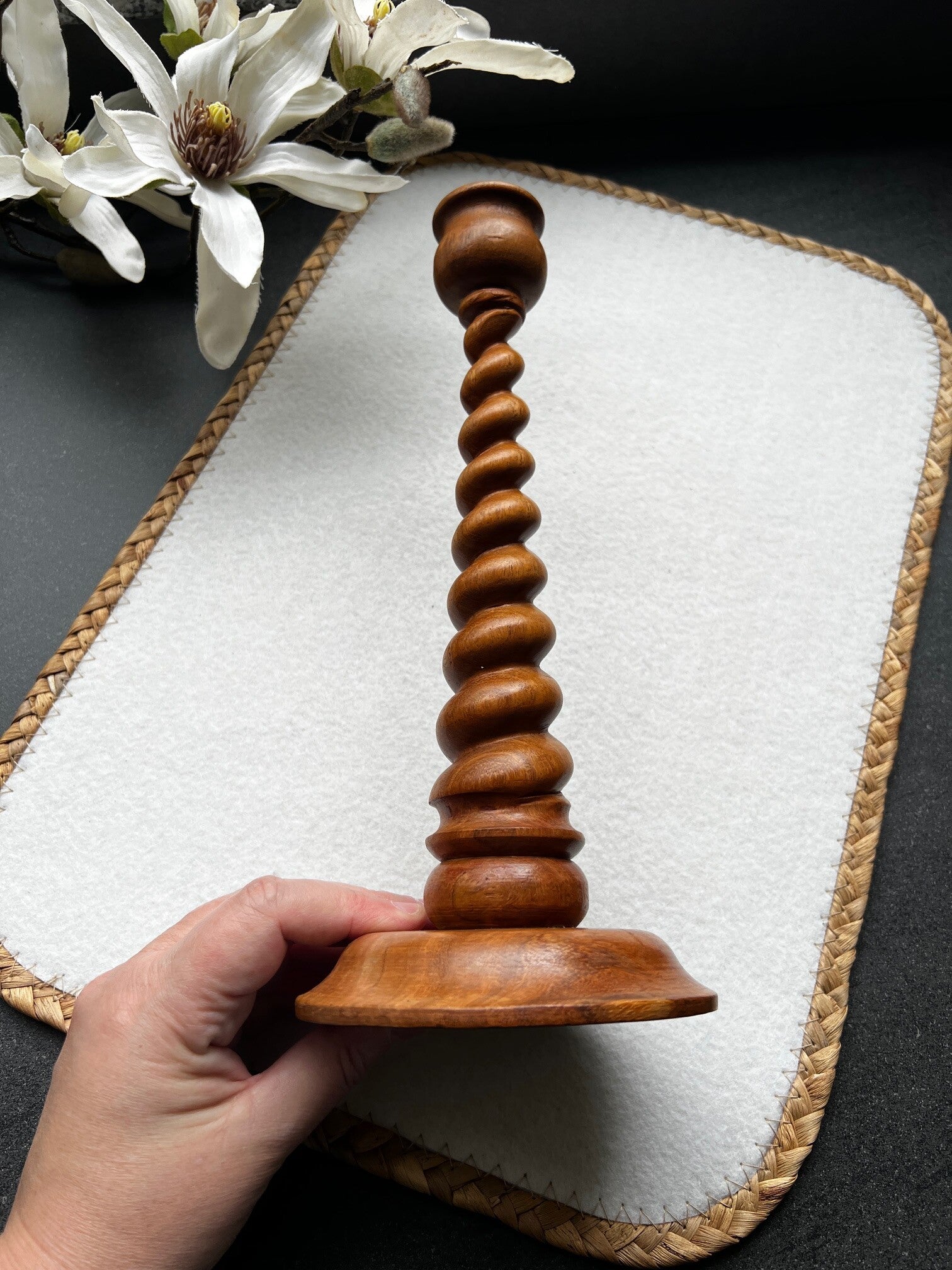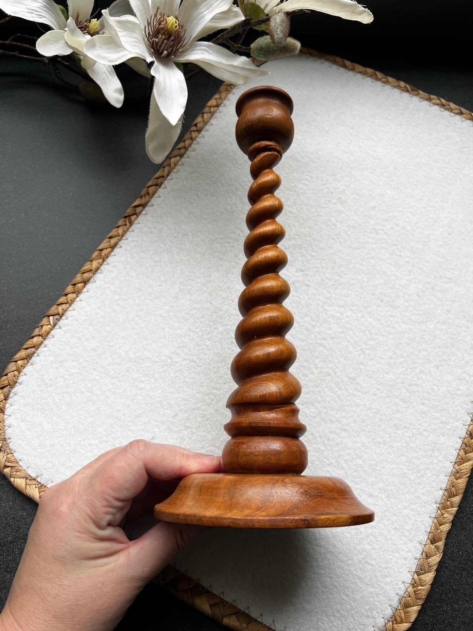 Mooie vintage handgedraaide houten kandelaar met decoratieve spiraal / barley twist vorm. Een tijdloos en warm decoratiestuk dat goed past in een landelijk, rustiek of vintage interieur. Waarschijnlijk gemaakt in de jaren 60–80 en met de hand gedraaid op een houtdraaibank. Door de slanke vorm en warme houtkleur is het een echte blikvanger op tafel, dressoir of vensterbank. Hoogte: ca. 28 cm Materiaal: massief hout Staat: goede vintage staat met lichte gebruikssporen passend bij de leeftijd.