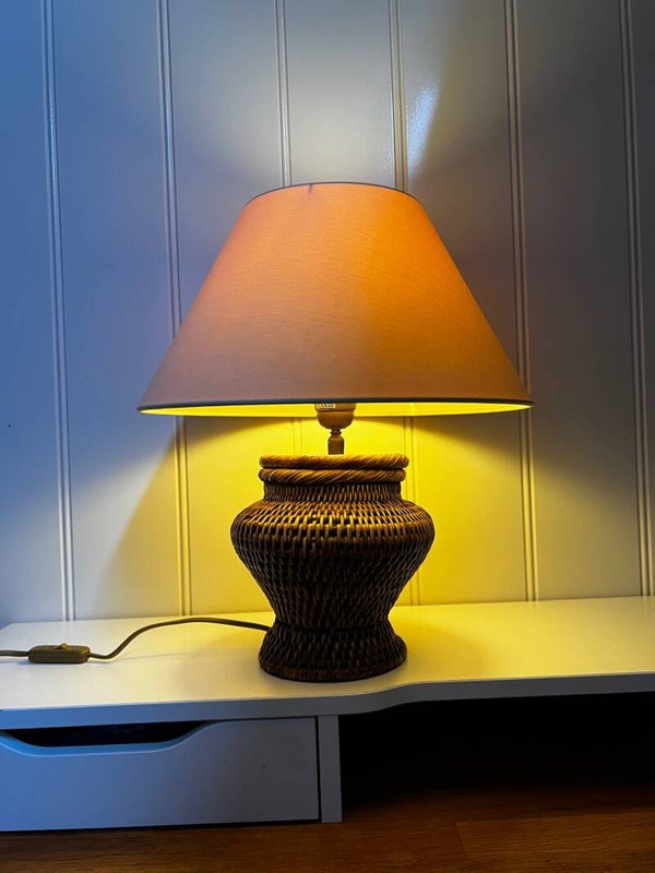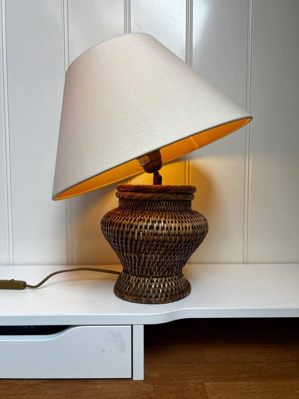 Sfeervolle vintage tafellamp met rotan voet en verstelbare kap. De kap is kantelbaar, waardoor je het licht mooi kunt richten – praktisch én speels. Geeft een warme, gezellige gloed en past perfect in een boho, Ibiza of Japandi interieur.