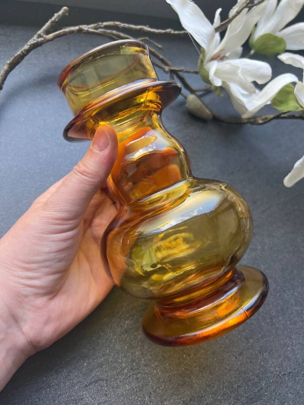 Prachtige Fins design ! Amberkleurige hyancinth glazen vaas met een elegante, ronde vorm en stevige voet. Dit type vaas geeft direct warmte aan je interieur en past perfect in een retro, vintage of modern stijl. Door de mooie glans en warme kleur is hij ook zonder bloemen al een echte eyecatcher